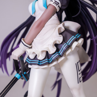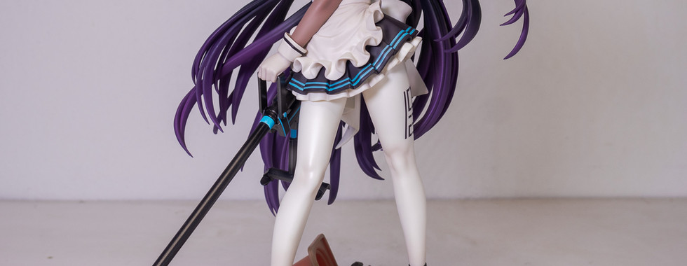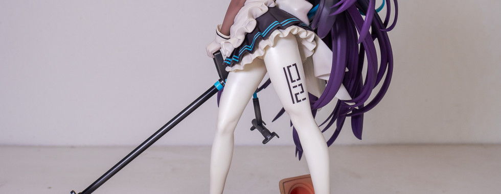 Her club uniform has intricate details as well. The creases on the apron are as faithful as the source material. The dress portion of the uniform also has hidden creases at the back as well on the leggings which are clearly not visible on the source material, but is a beautiful translation by the sculptor. A detail I also like from the leggings is her codename imprint which looks really cool. Lastly her signature weapon, Hawkeye, has a subtle reflective black painting while the blue areas of the weapon have a more matte finish. They even added the logo for Millenium Science School on her weapon which is something we see on the weapon's in-game artwork but not on the figure itself.